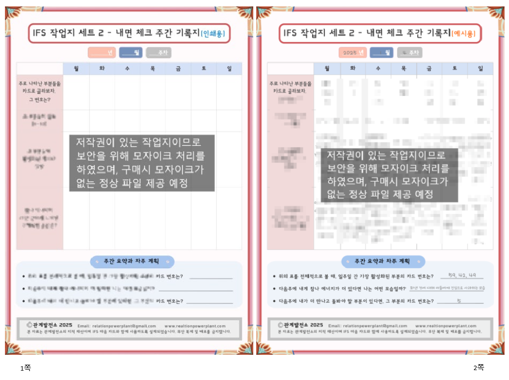 IFS 마음 카드를 갖고 한 주간 주로 나타났던 부분과 활성화되었던 순간 및 참나 에너지를 체크해, 자신의 패턴을 알 수 있도록 구성.