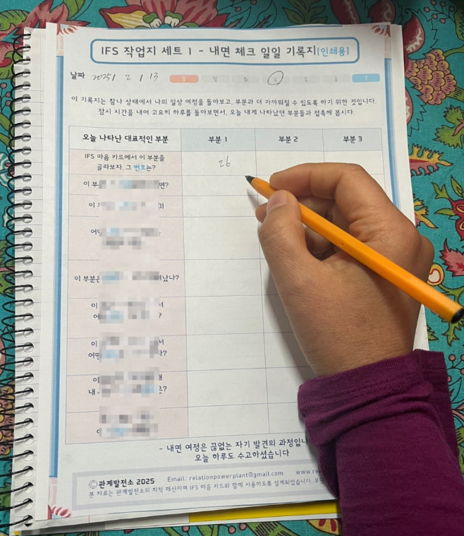 IFS 마음 카드를 갖고 매일 내면을 체크, 그날 나타났던 부분들을 3개까지 알아보도록 함.