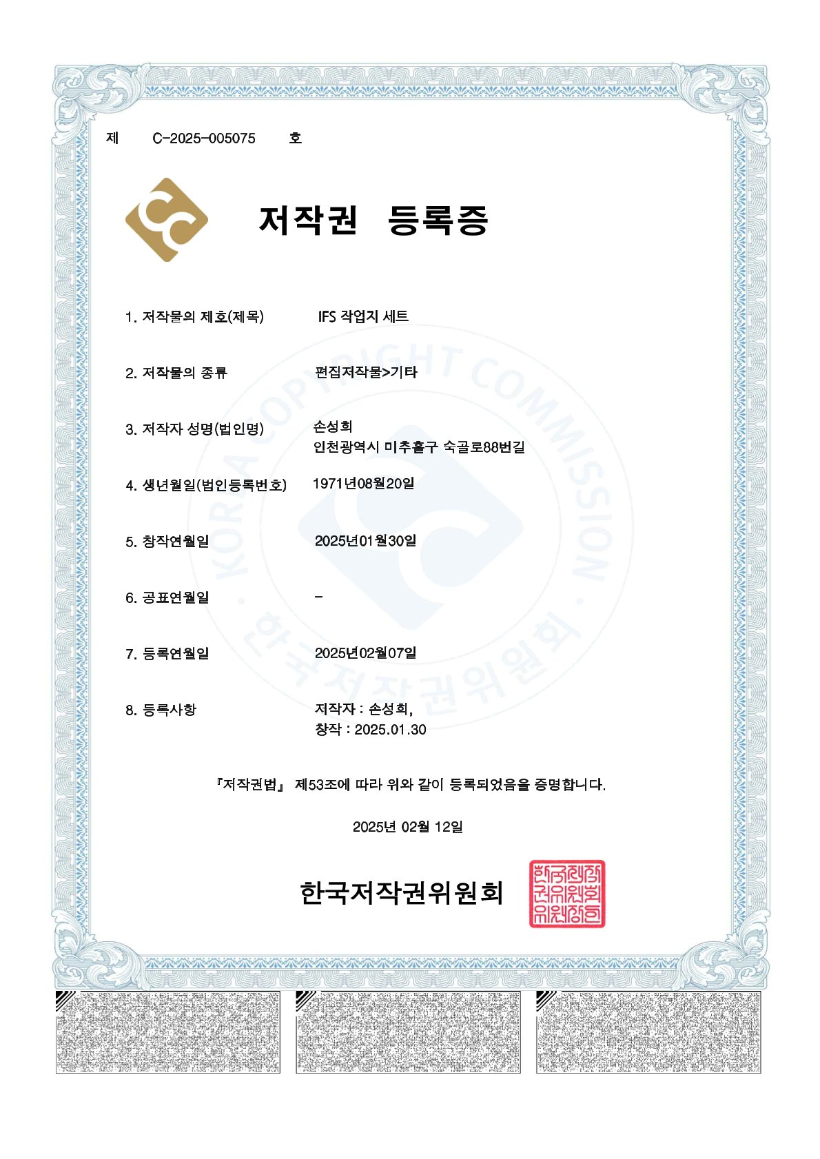IFS 작업지 4종 세트는 한국저작권위원회의 저작권 보호를 받고 있으므로 무단 전재와 복제의 경우 처벌을 받게 됩니다.