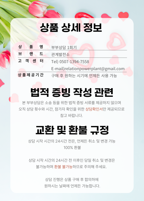 1단계) 결제 시, 반드시 옵션에 상담을 원하는 날짜 및 요일과 시간을 3개까지 적어주세요. 2단계) 하단의 링크에서 남편, 아내 양쪽 각각 상담 신청서를 작성해 보내주세요. 3단계) 결제를 마치시면, 상담 약속 컨펌을 위해 카카오톡이나 메일 등으로 연락을 드립니다. |