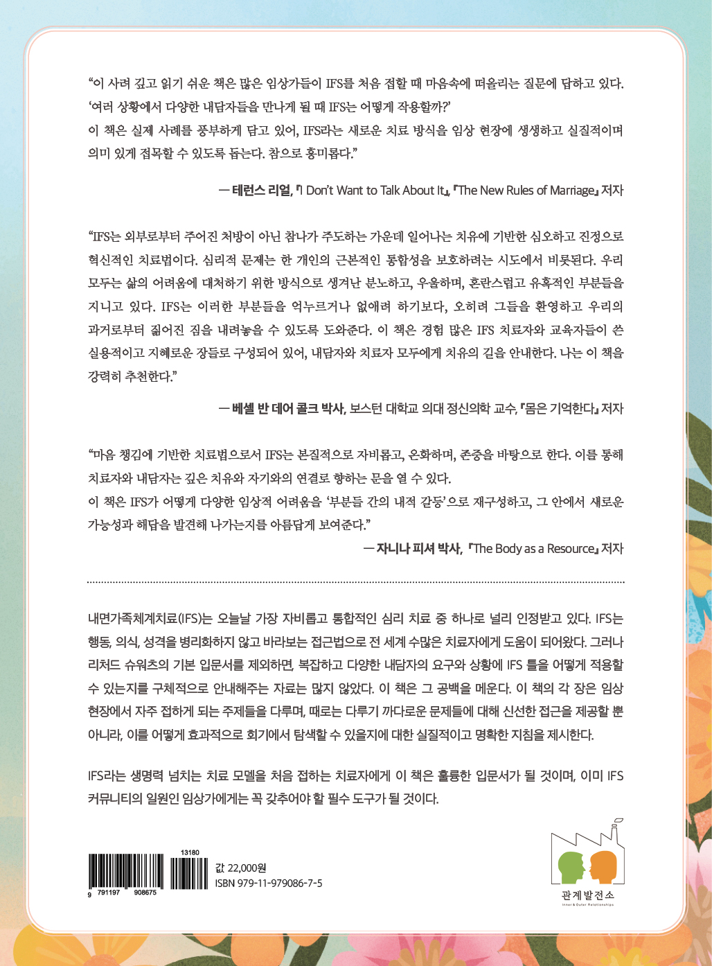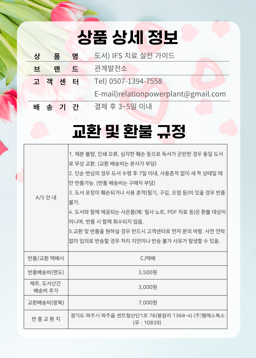 📦 정가: 22,000원 (배송비 무료) 🎁 관계발전소 구매자 사은품: IFS 상담 기록지 상담자용, 내담자용 2종(총 3쪽) 세트 PDF |