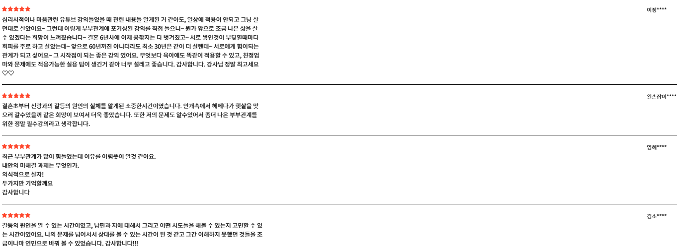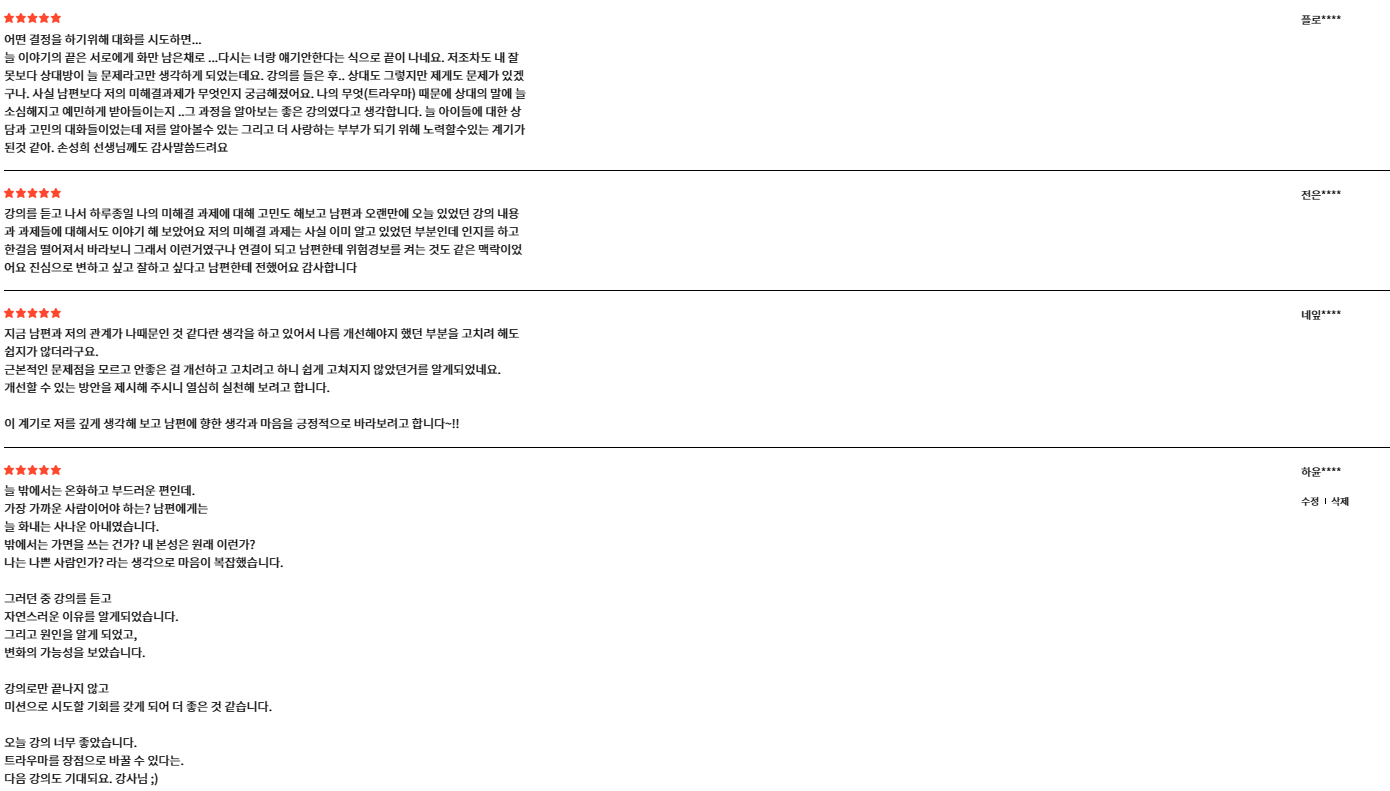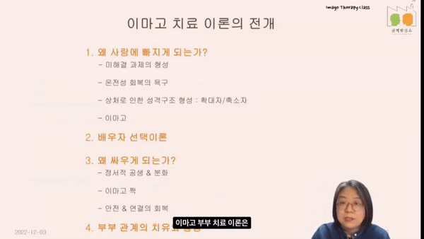 | 4차시 | 33분 32초 | (2) 인정하기 (3) 공감하기 (4) 미해결과제 - 워크 시트지 배부 (5) 이마고 부부대화법 총정리 |
