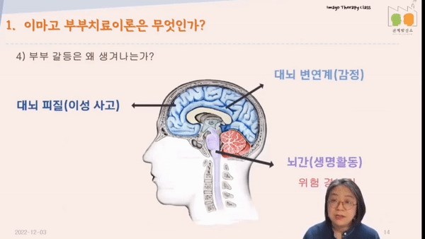 1차시 | 1시간 7초 | 1. 이마고 부부치료 개요 (1) 이마고 부부치료 이론은 무엇인가? 1) 개발자 2) 배경이론 3) 이마고란 4) 부부갈등은 왜 생겨나는가? |