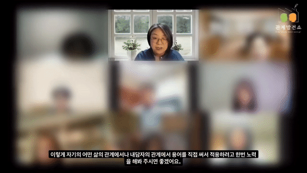 | 6차시 | 34분 41초 | (4) 미해결과제 - 워크 시트지 활용 - 나의 부부관계 패러다임 형성에 미친 요인 분석하기 - 미해결과제에 대한 실습 설명 - 실습 후 나눔 |