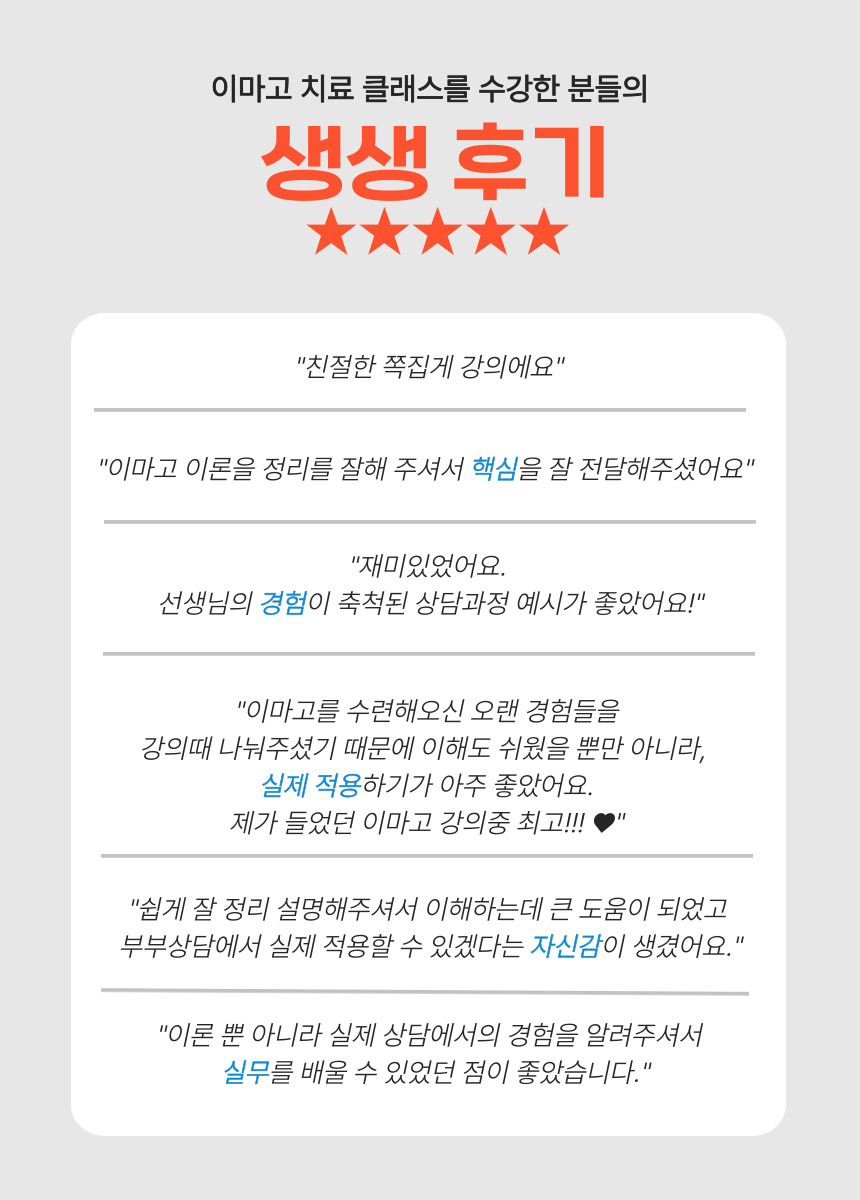 | 8차시 | 1시간 15초 | (3) 이마고 상담 테크닉 (4) 자주 쓰게 되는 문장 줄기 1 (5) 자주 쓰게 되는 문장 줄기 2 4. 이마고 부부치료에 대한 평가 ※ Q & A |